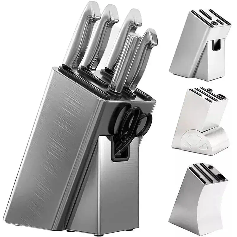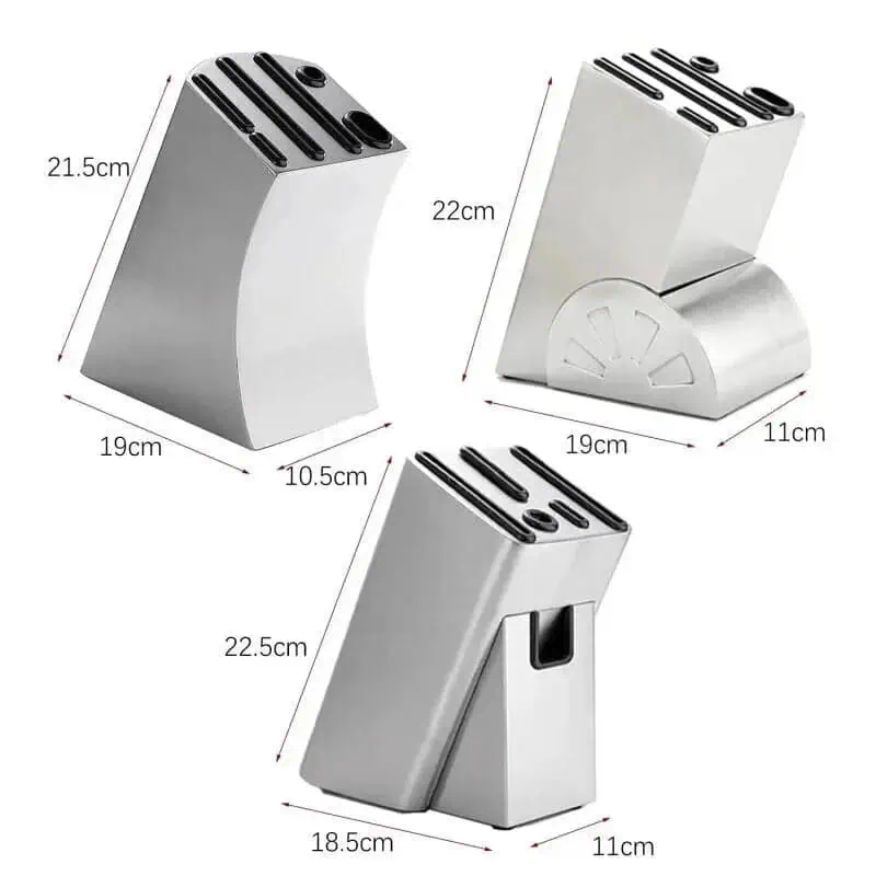 Unser Messerblock aus Edelstahl bietet den idealen Mix aus Funktion und Stil, der sich nahtlos in jede Kücheneinrichtung einfügt. Jeder Slot im Block ist so designend, dass er jede Art von Messer sicher und ordentlich aufbewahrt, was Ihre Küche nicht nur sicherer macht, sondern auch das Erscheinungsbild Ihrer Arbeitsfläche enorm aufwertet.